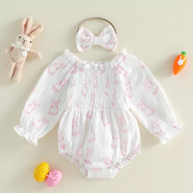 Make your baby girl’s first Easter or spring outing extra special with this Bunny Print Ruffled Trim Bodysuit and Bow Headband Set. With its whimsical design, cozy fabric, and thoughtful details, it’s sure to be a favorite in your baby’s wardrobe. Don’t miss out on this enchanting outfit that combines comfort, cuteness, and seasonal charm.